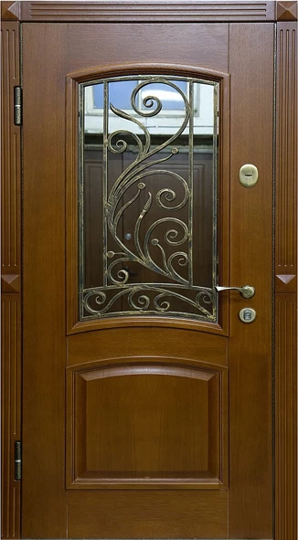 Поговорим об отделке. Вариантов декора дверей много. В большинстве случаев, для отделки элитных дверей используется массив натурального дерева или натуральный шпон с фрезеровкой. Цвет двери так же делается по желанию заказчика. Очень красиво и представительно выглядят двери с ковкой и стеклом.